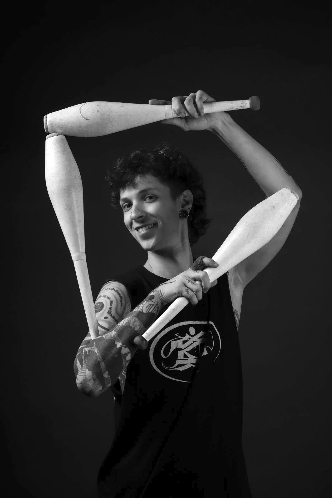 2019 habe ich den Kontaktstab entdeckt und täglich Stunden damit verbracht, parallel dazu lernte ich mit drei Keulen jonglieren und fusionierte später diese zwei Disziplinen in die Stabmanipulation mit bis zu vier Objekten. Nebenberuflich spiele ich Feuershows und lernte deshalb Poi. Momentan pushe ich meine Jonglage mit 5 Keulen.